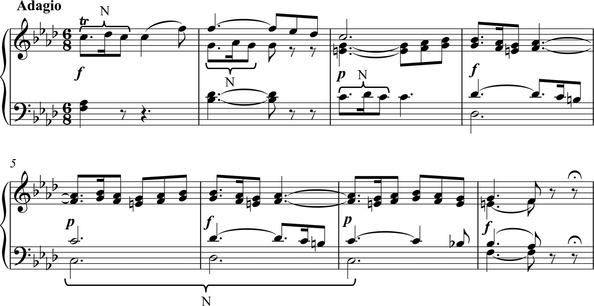 Example 1.3 Neighbor (N) motives in Mozart’s Piano Sonata in F, K. 280 (II), mm. 1–8.