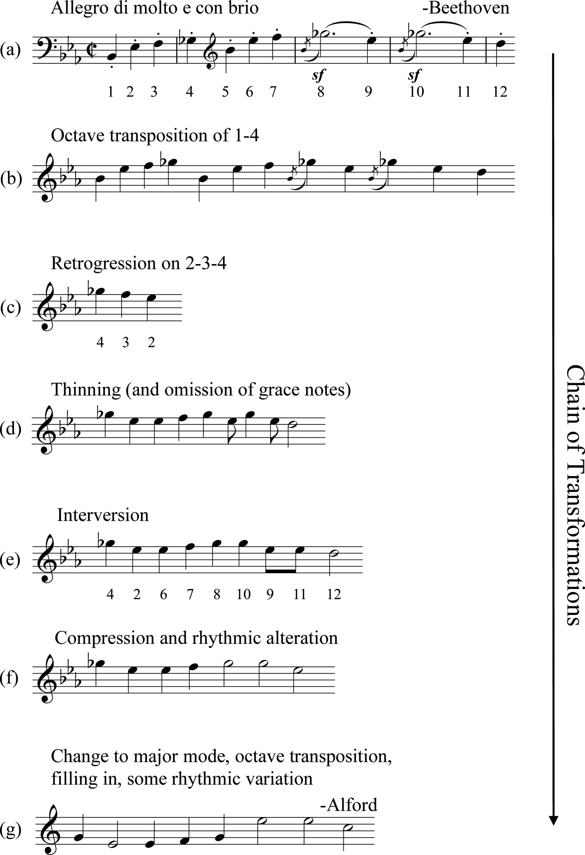 Sharpe’s demonstration is designed to produce a laughable result; therefore, both it and its accompanying claim that “there is something wrong with a theory that allows” for such shenanigans may be set aside (Sharpe 1983, 279–280). The goal of motivic analysis is not to impose far-fetched readings on works. It is to clarify the nature of already-intuited connections. As in all things musical, this requires a fair amount of analytic know-how. Convincingly establishing a motivic connection between dissimilar shapes is difficult. An analyst must sense the underlying unity, seek an explanation for the similarity—hidden correspondences in pitch, rhythm, contour, and so forth—and effectively communicate the finding to the audience.