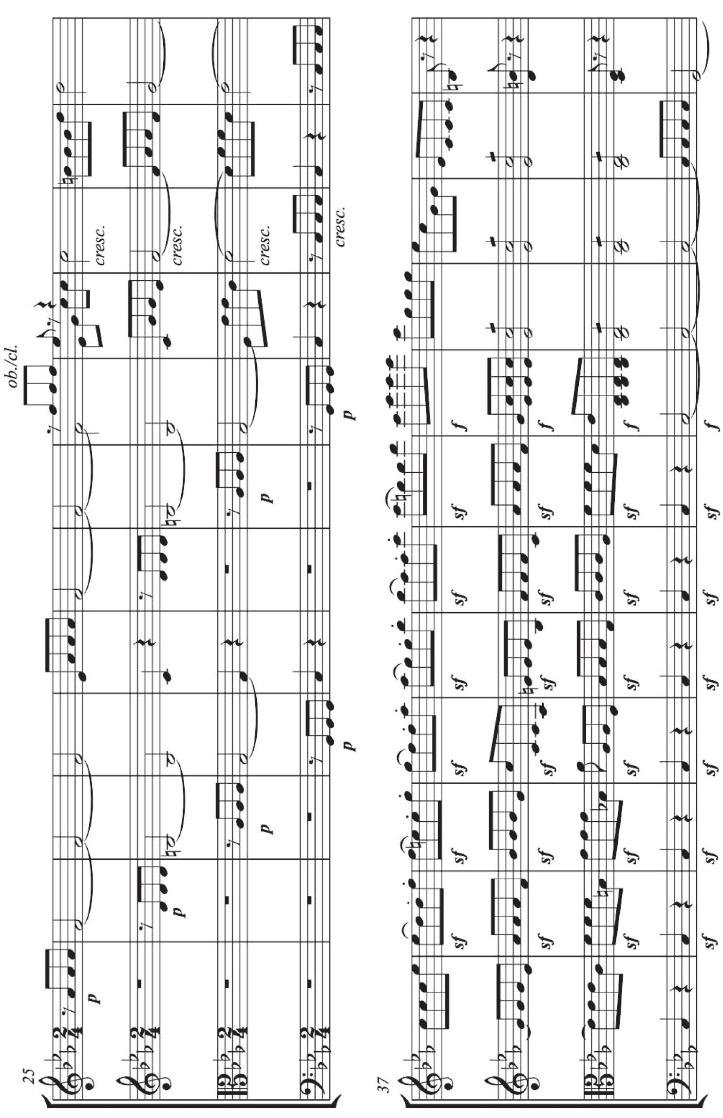 This connection invites us to speculate on a mechanism by which musical motives produce emotion. The motives of a piece, consciously attended to or not, are perceived as figures in motion. The listener’s mind hears these shapes while simultaneously re-creating them. This produces a cascade of novel thoughts. The brain’s self-awareness that it is thinking new things and traveling through virtual space—and all this quite without effort!—causes pleasurable sensations: feelings of inspiration, joy, excitement, and so forth. This mental activity engenders secondary physiologic responses in the brain, where neurotransmitters are triggered and neurochemicals released, and in the body, where heart rate and vasodilation are impacted by hormonal signals.10 In the