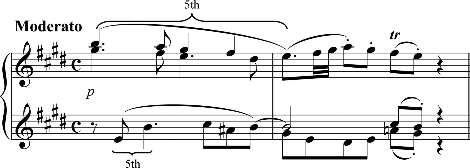 Even in cases where this kind of patterning is absent, an open interval can sound striking enough to suggest itself as an important span to be explored. In Haydn’s Piano Sonata 31 in E, Hob. XVI: 31 I, shown in Example 1.4, the first melodic gesture heard is given by the left hand. It is the intervallic fifth, E4-B.