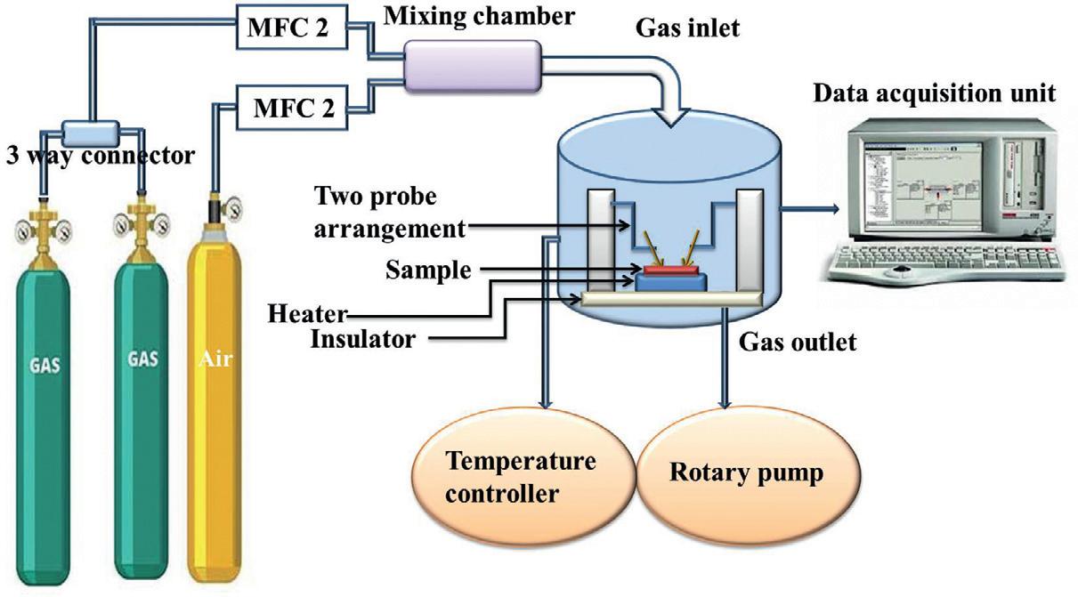 Adynamicsystemconsistsofgascylinderswithaknownconcentration,massflowcontrollers(MFCs),atestchamberwithagasinletandoutlet,heatingarrangement,electricalmeasurementarrangements,anddataacquisitionsystems,asshownin Fig.1.5.Withthe helpofMFCs,theflowrateofanalytegasesandsyntheticaircan becontrolled.Theconcentrationofanalytegasescanbechangedby mixingproperlywithsyntheticairornitrogeninamixingchamber connectedpriortothetestchamber.Thenthemixedvolumeofgas