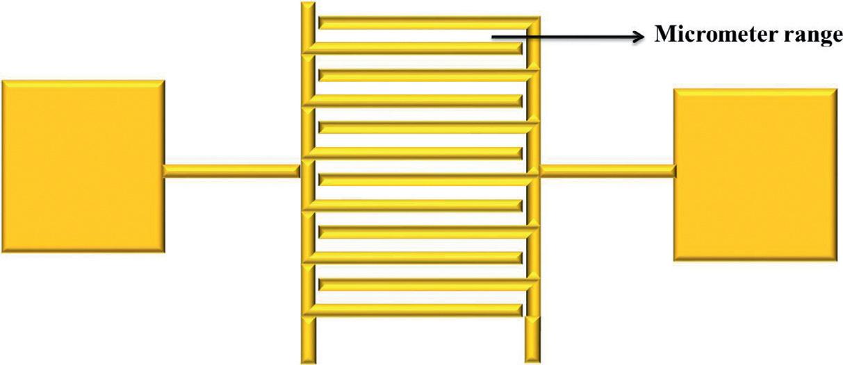Thetubularconfigurationisshownin Fig.1.2A.Si/SiO2 oraluminasubstratewithpreprintedinterdigitatedgoldelectrodesiscommonlyused forthefabricationofplanarsensors(Fig.1.2B).Aschematicdiagram oftheinterdigitatedpatternisshownin Fig.1.3.Theuseofplatinum electrodesislimitedduetotheirhighcost.InsuchcasesAuelectrodes aremorepreferred.Theworkingtemperatureisobtainedbyplacing thedeviceontheexternalheaterorwiththehelpofaninternalheater printedatthebackofthesubstrate.Theplanarconfigurationismore