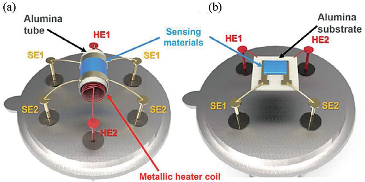 Figure1.2. Schematicdiagram ofmetaloxidegassensor configurations:(A)tubularand (B)planar(SEandHErepresent thesensorelectrodeandheater electrode,respectively). Reproducedwithpermission from(Lee,2018),Copyright2018, Elsevier.