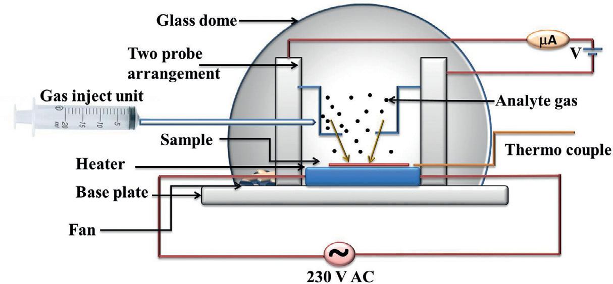 ispassedintothetestchamberthrough thegasinlet.Thesampleisplacedon anexternalheaterandtheworkingtemperaturecanbecontrolledwithatemperaturecontroller.Thesampleisconnectedtoameasurementunittorecord thecurrentvariationcontinuously.Duringmeasurement,thecurrentthrough thesampleinairandinthepresence ofanalytegasatdifferenttemperatures isrecorded.Finally,afterthemeasurement,thegasfromthetestchamberis removedwiththehelpofarotarypump arrangement.