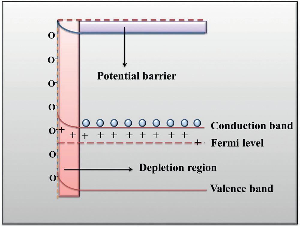 Theextractedelectronsfromthe conductionband(Ec )leavebehindpositivelychargedions,resultinginupward bandbendingandtheformationofan electron-depletionregionoraspacechargelayerintheMOS,asshownin Fig.1.1.Theheightanddepthofthe bandbendingdependontheamount andtypeofadsorbedoxygen.Dueto theformationoftheelectrondepletion region,anincreaseintheresistanceof theMOScanbeobserved.Whenthis surfaceisexposedtoreducinggases suchasacetoneandammonia,theadsorbedoxygenionsinteractwiththetargetgasesandthetrappedelectronsare releasedbackontotheMOSsurface.Theamountofoxygenremoved fromthesurfaceisproportionaltotheconcentrationofthereducing gas.Thustheheightanddepthofbandbendingandtheresistance oftheMOSdecrease(Ananya,2018; Shankaretal.,2016; Wangetal., 2010).TheoxygendesorptionfromtheMOSsurfaceinthepresenceof areducinggas(say,R)canbedescribedasfollows: