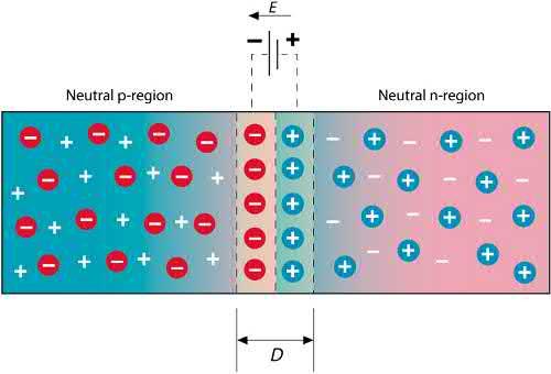 Onthen-side,electronsmovebydiffusiontowardthep-side(where theirconcentrationisordersofmagnitudelower),leavingpositively chargedionsbehindthem.Similarly,holesonthep-sidetendtodiffuse tothen-side(wheretheirconcentrationissignificantlylower),thuscreatingnegativelychargedions.Thepresenceofnegativelyandpositively chargedionsinclosecontactgivesrisetoanelectricfieldattheinterface betweenthetworegions,repellingelectronsinthen-sideandholesin thep-side.Theregionwheretheelectricfieldarisesiscommonlyreferred as depletionregion (D)sinceitisdepletedofcarriers.Consequently,two competingmechanismsconstitutethedrivingforcesforthemovementof chargecarriersinthecell: diffusion,causedbythegradientincarrierconcentration,representsthemaindrivingforceinthepandnneutral regions,whereas drift,causedbytheinteractionbetweentheelectricfield andtheelectricalchargesholdbyelectronsandholes,principallycontrols themovementofchargecarriersinthedepletionregion.