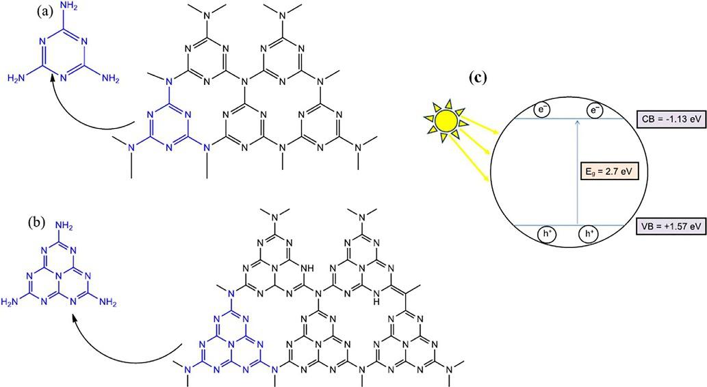 bandwillhavenitrogenPz orbitals,whereastheconductionbandwillhavecarbonPz orbitals;therefore,Catomsactaspointswherereductionoccurs,andNatomsactas pointswhereoxidationoccurs [24].Asaphotocatalyst,g-C3N4 tendstosplittheholes andelectrons.The2.7eVofbandgapallowsittoabsorbsunlight,whichisusedtopurify water,producehydrogen,andusedforsolarcellapplications [25]. Fig.1.1Crepresentsa chargetransfering-C3N4.