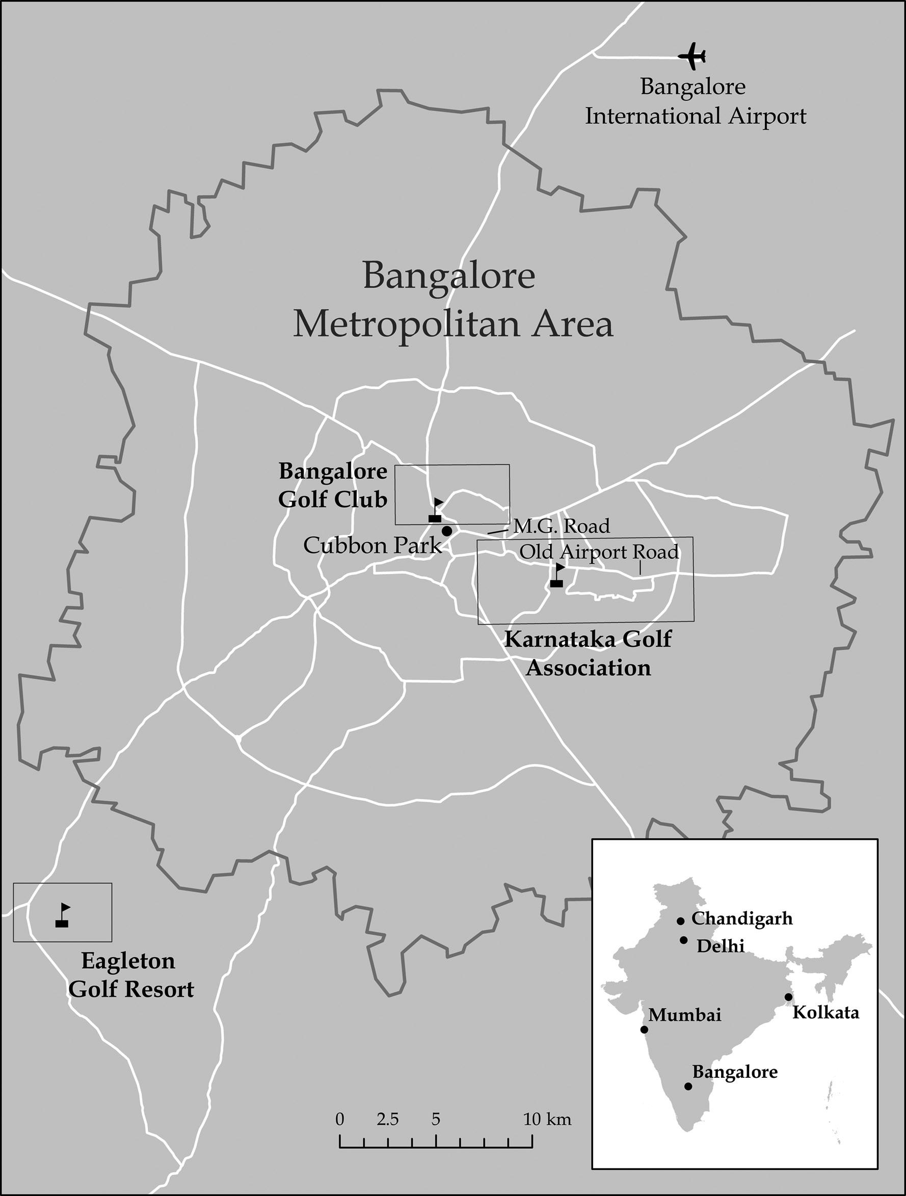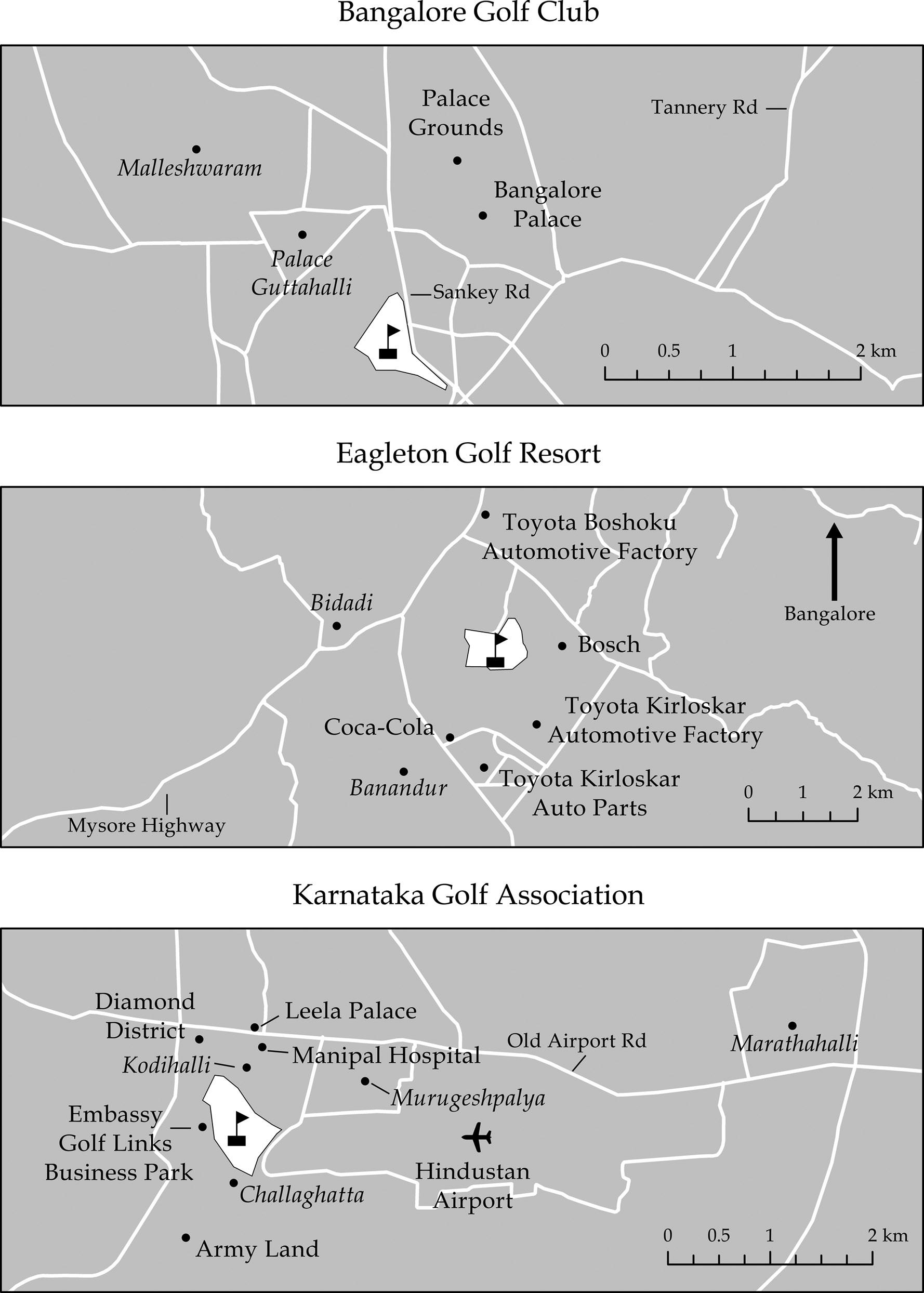 I paid Ravi 150 rupees for one-hour lessons. We’d start at seven in the morning, three to four days a week, just as BGC and KGA members living on this side of town were showing up to practice. I met several of these members—mostly, if not all of them, men.14 In a matter of weeks, they invited me to the clubs for meals and drinks to hang out with them and their friends. Soon, I was visiting the clubs daily, eventually taking a sixmonth membership at the KGA, and playing at both clubs, thanks to an arrangement between the two;15 I later incorporated visits and rounds of golf at a third club, the Eagleton Golf Resort, south of the city. I sat with members on clubhouse patios, visited them in their offices and homes, and at bars and restaurants, but always in air-conditioned spaces tucked away behind secured fences and walls, far removed from the poverty of India.