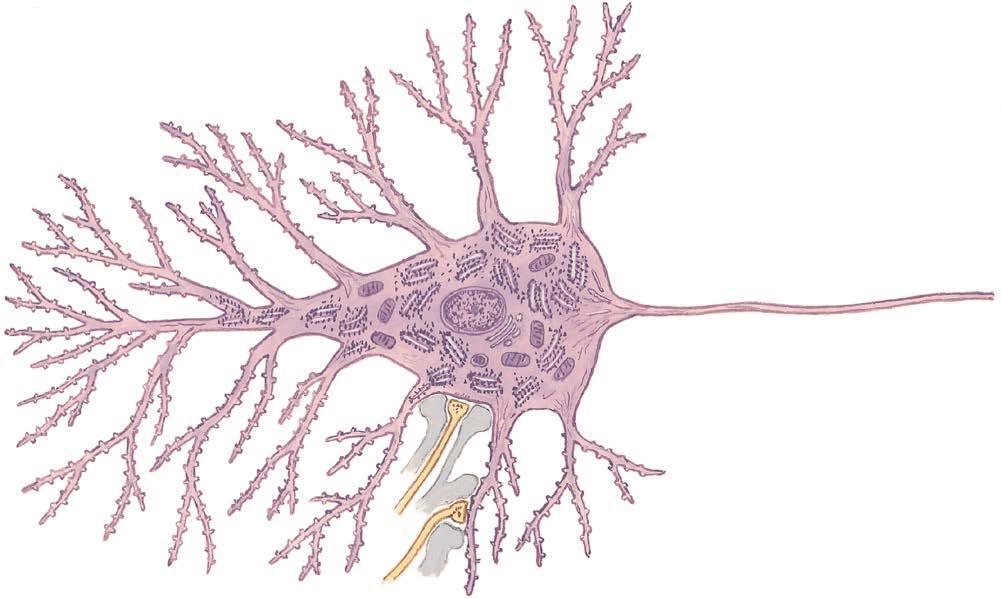 Neuronal structure reflects the functional characteristics of the individual neuron. Incoming information is projected to a neuron mainly through axonal terminations on the cell body and dendrites. These synapses are isolated and are protected by astrocytic processes. The dendrites usually make up the greatest surface area of the neuron. Some protrusions from dendritic branches (dendritic spines) are sites of specific axodendritic synapses. Each specific neuronal type has a characteristic dendritic branching pattern called the dendritic tree, or dendritic arborizations. The neuronal cell body varies from a few micrometers (μm) in diameter to more than 100 μm. The neuronal cytoplasm contains extensive rough endoplasmic reticulum (rough ER), reflecting the massive amount of protein synthesis necessary to maintain the neuron and its processes. The Golgi apparatus is involved in packaging potential signal molecules for transport and release. Large numbers of mitochondria are necessary to meet the huge energy demands of neurons, particularly those related to the maintenance of ion pumps and membrane potentials. Each neuron has a single (or occasionally no) axon, usually emerging from the cell body or occasionally from a dendrite (e.g., some hippocampal CA neurons). The cell body tapers to the axon at the axon hillock, followed by the initial segment of the axon, which contains the Na+ channels, the first site where action potentials are initiated. The axon extends for a variable distance from the cell body (up to 1 m or more). An axon larger than 1 to 2 μm in diameter is insulated by a sheath of myelin provided by oligodendroglia in the central nervous system (CNS) or Schwann cells in the peripheral nervous system (PNS). An axon may branch into more than 500,000 axon