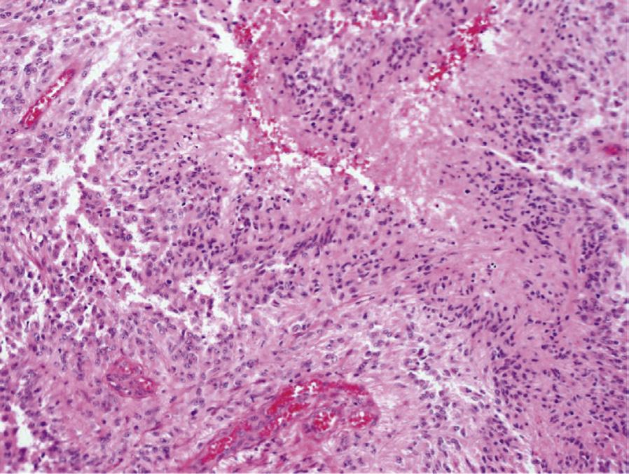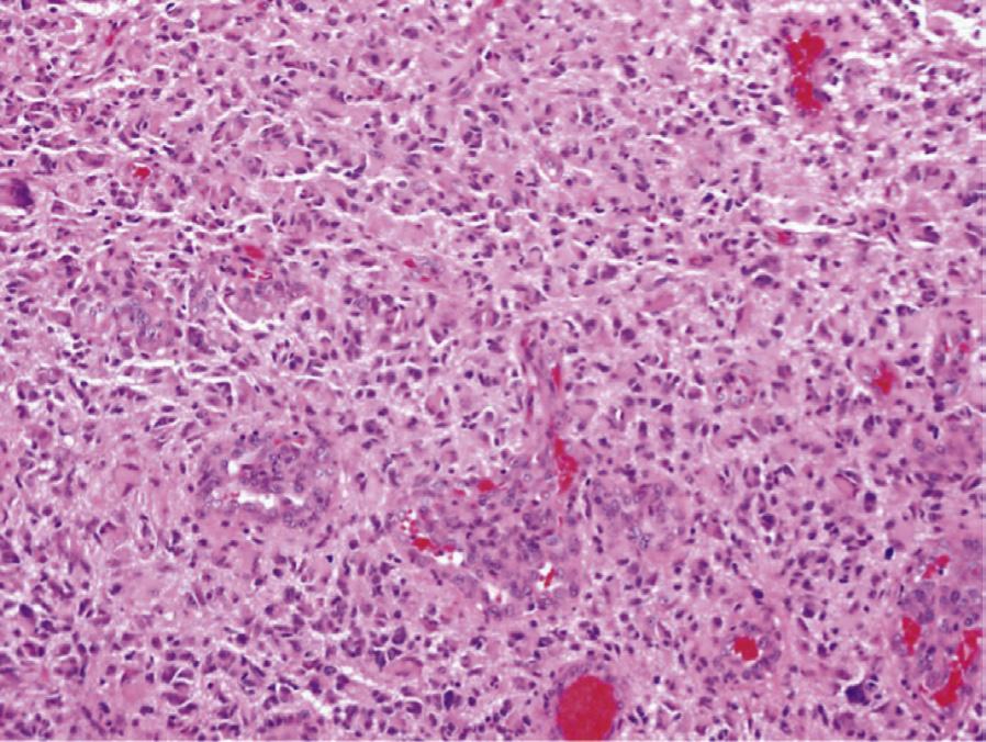 In addition to features important to grading, other histologic features readily apparent on H&E sections include tumor cell morphology and growth features, which are characteristic of certain lineages. Oligodendroglioma tumor cells are classically associated with round nuclei within cells that have clear cytoplasm, resulting in a “fried egg” appearance. These tumor cells are often distributed within a network of fine capillary-like vessels reminiscent of a “chicken wire” pattern. Astrocytomas often have irregularly shaped nuclei that may be eccentrically displaced (or pushed to the side of the cell); when associated with abundant amounts of pink cytoplasm, it is commonly referred to as gemistocytic morphology.