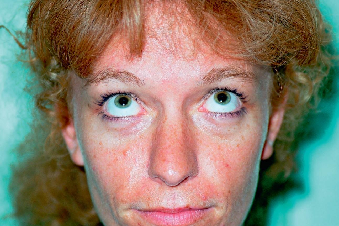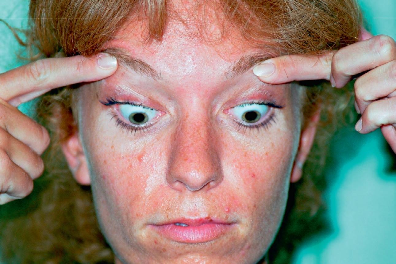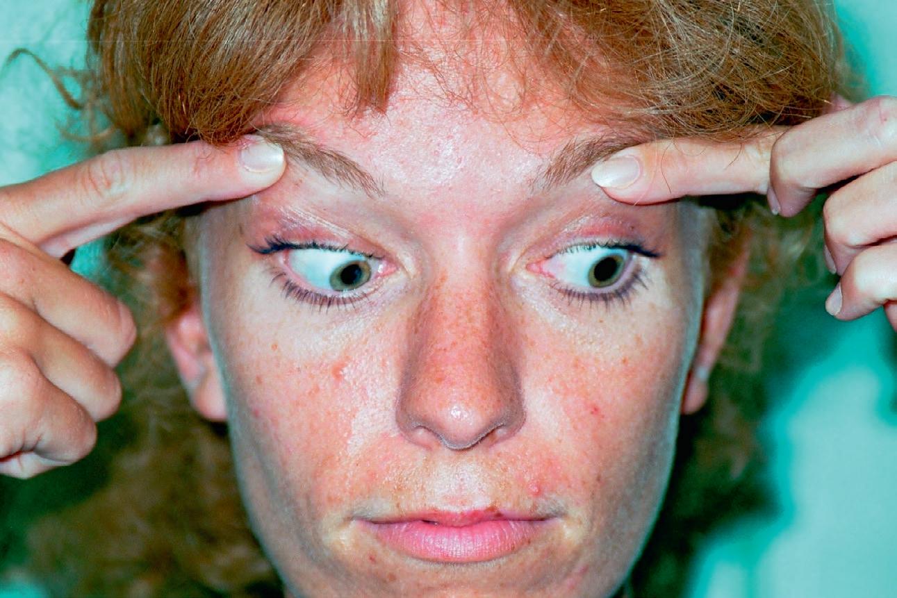 ◗ Figure 1.8 Manœuvre de Bielschowsky effectuée dans le cas d'une paralysie de l'oblique supérieur droit. En position primaire, il existe une discrète hypertropie droite (a) qui se majore nettement lors de l'inclinaison de la tête du même côté (b). L'inclinaison de la tête du côté opposé diminue l'écart entre les deux yeux (c).