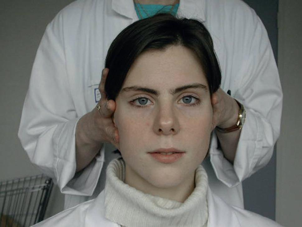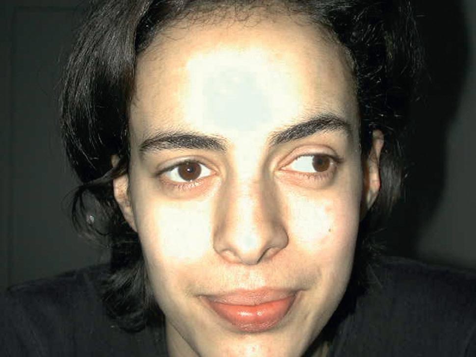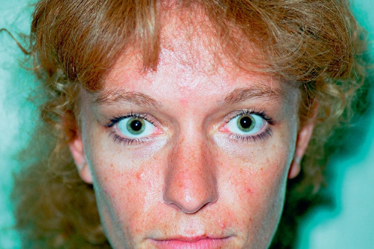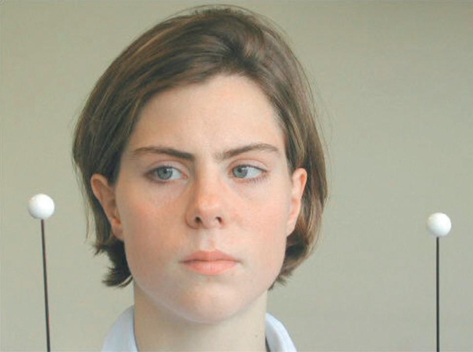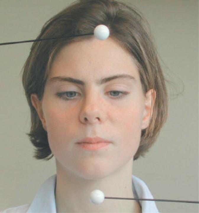 ◗ Figure 1.8 Manœuvre de Bielschowsky effectuée dans le cas d'une paralysie de l'oblique supérieur droit. En position primaire, il existe une discrète hypertropie droite (a) qui se majore nettement lors de l'inclinaison de la tête du même côté (b). L'inclinaison de la tête du côté opposé diminue l'écart entre les deux yeux (c).