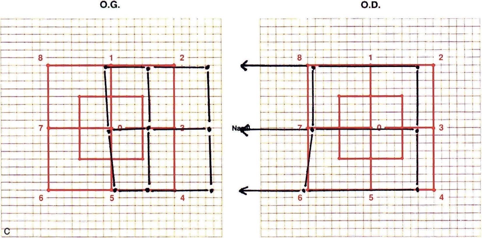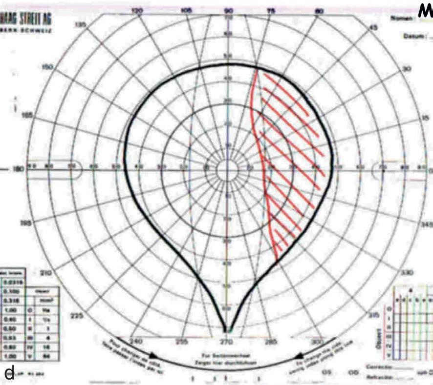 Examen coordimétrique de Heiss-Weiss dans une paralysie du VI gauche (c). Champ visuel binoculaire du regard chez un sujet avec une paralysie du VI droit (d). La diplopie est perçue dans une région (en rouge) du champ visuel latéral droit.