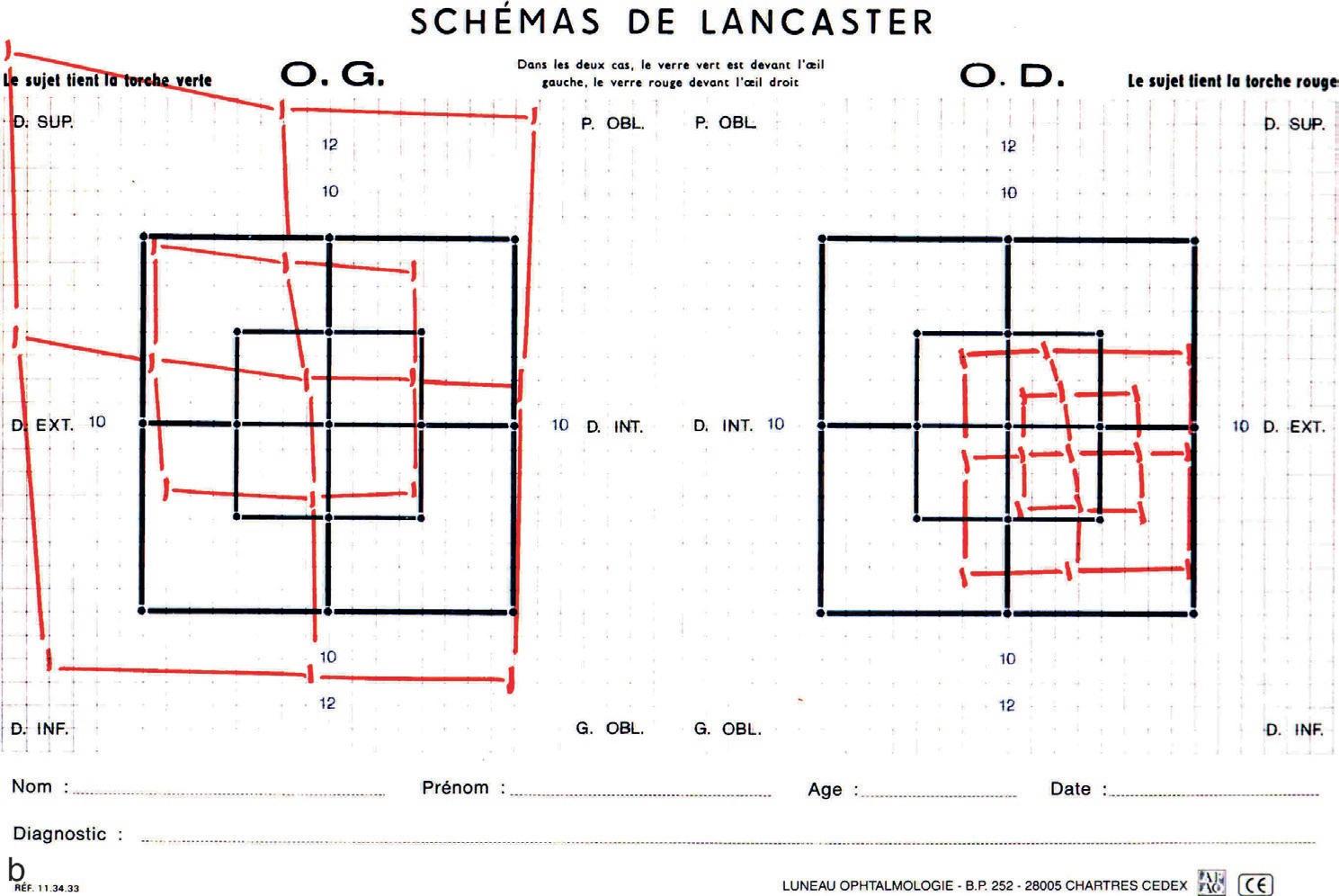 Le patient équipé de lunettes dissociantes (verre rouge devant un œil, verre vert devant l'autre œil), tête fixe, suit du regard le déplacement du spot lumineux indice V/4 et signale le dédoublement du spot. L'examen permet de délimiter les zones de vision monoculaire, les zones de fusion et les zones de diplopie. Le champ visuel binoculaire du regard permet d'objectiver la gêne fonctionnelle causée par la diplopie (figure 1.11d) et de suivre l'évolution de la paralysie oculomotrice dans le temps.