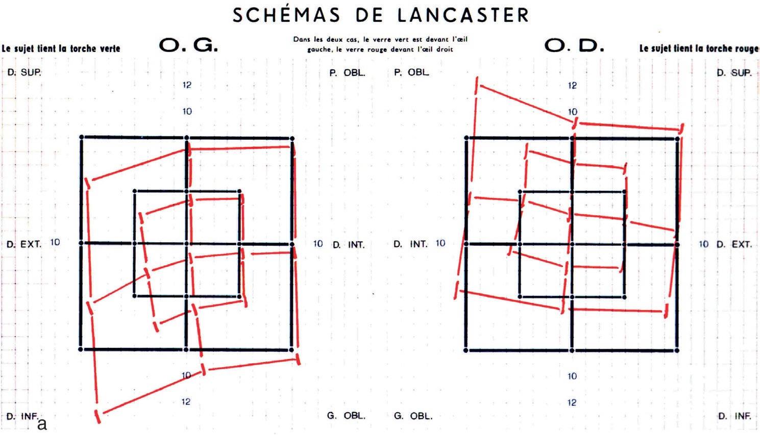 a. Le patient regarde une lumière brillante devant lui et décrit s'il voit les deux images vues par chacun des deux yeux alignées ou séparées, et détermine l'amplitude relative de séparation dans les 8 positions cardinales.