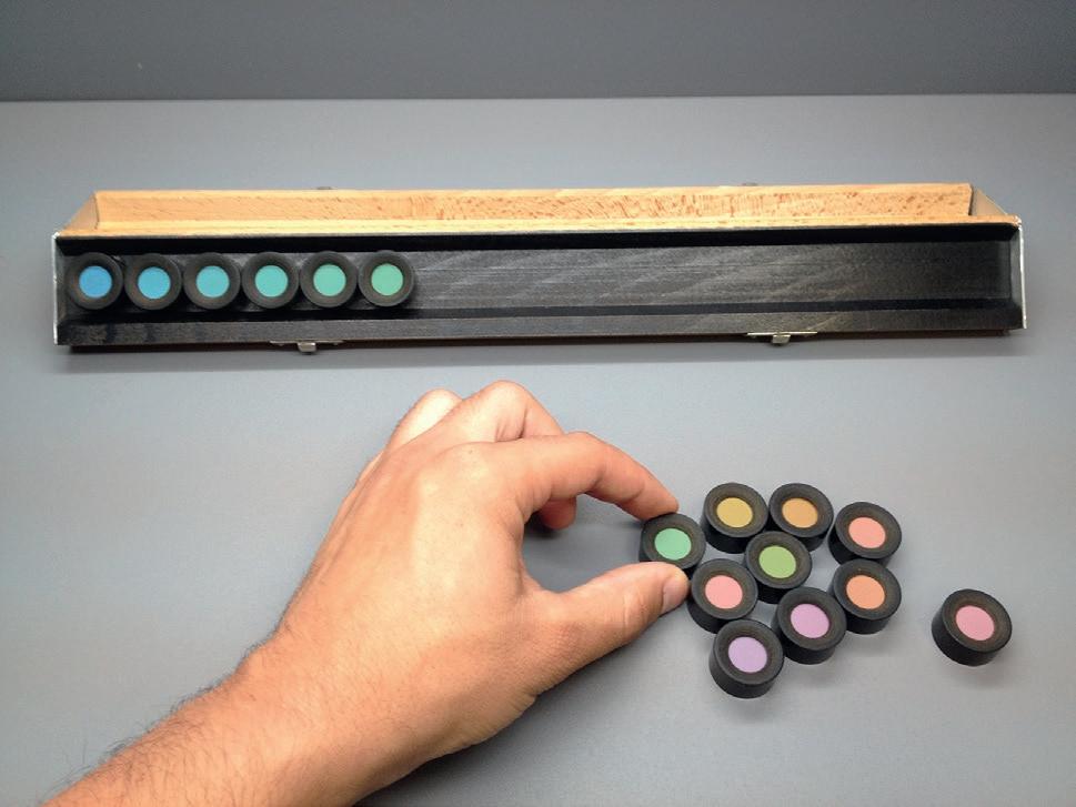Parmi les tests utilisant des planches pseudoisochromatiques, le test d’Ishihara permet d’évaluer l’intrication entre une DA et une éventuelle DC. On peut s’aider des tests SPP1, SPP2 et HRR (conçu pour dépister des DC et surtout pour les DA rouge-vert et les DA bleu-jaune). Afin de rechercher et quantifier une DA, on peut aussi effectuer l’appariement de pions colorés (dans un ordre croissant de complexité) : le test 15 Hue de Farnsworth saturé (figure 2.3) et, s’il est normal, le test 15 Hue désaturé de Lanthony, le test de 28 Hue et enfin le test de 100 Hue, ce dernier étant détaillé (85 pions) mais de réalisation longue.