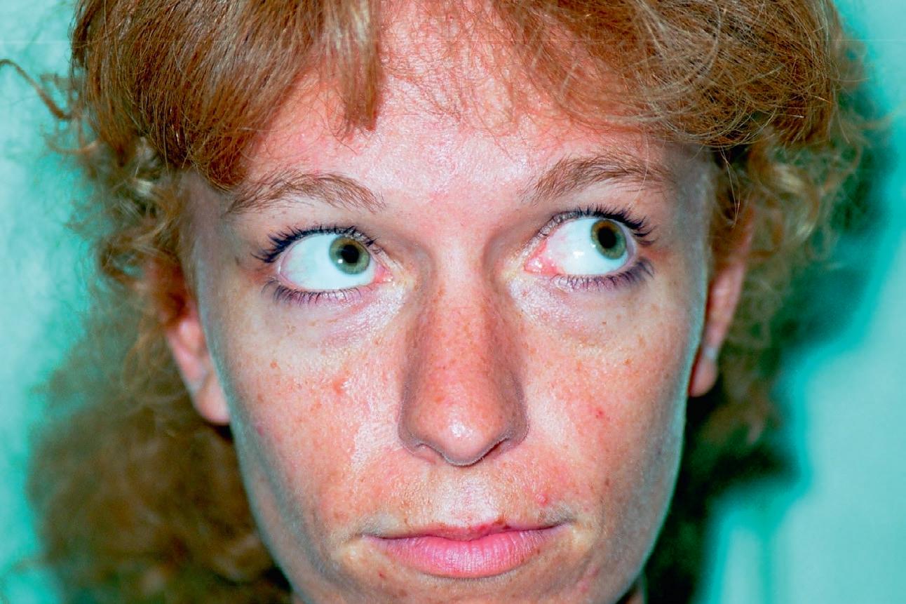 ◗ Figure 1.8 Manœuvre de Bielschowsky effectuée dans le cas d'une paralysie de l'oblique supérieur droit. En position primaire, il existe une discrète hypertropie droite (a) qui se majore nettement lors de l'inclinaison de la tête du même côté (b). L'inclinaison de la tête du côté opposé diminue l'écart entre les deux yeux (c).
