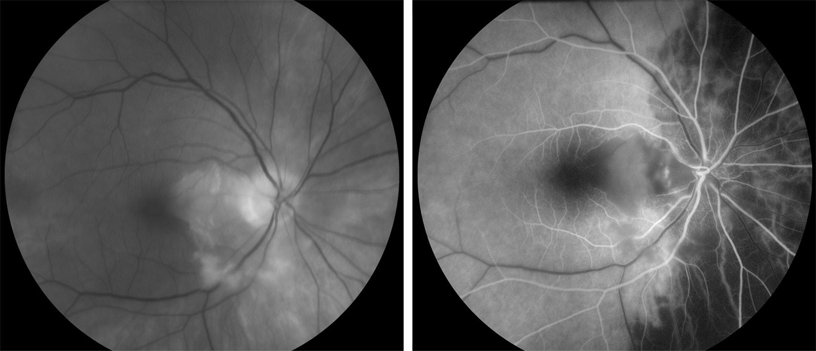 FIGU re 2.1. Fundus photograph demonstrating pallid optic disc edema due to AAION, with cilioretinal artery occlusion, in a patient with GCA (left). Fluorescein angiography shows patchy choroidal nonperfusion and cilioretinal artery occlusion (right).