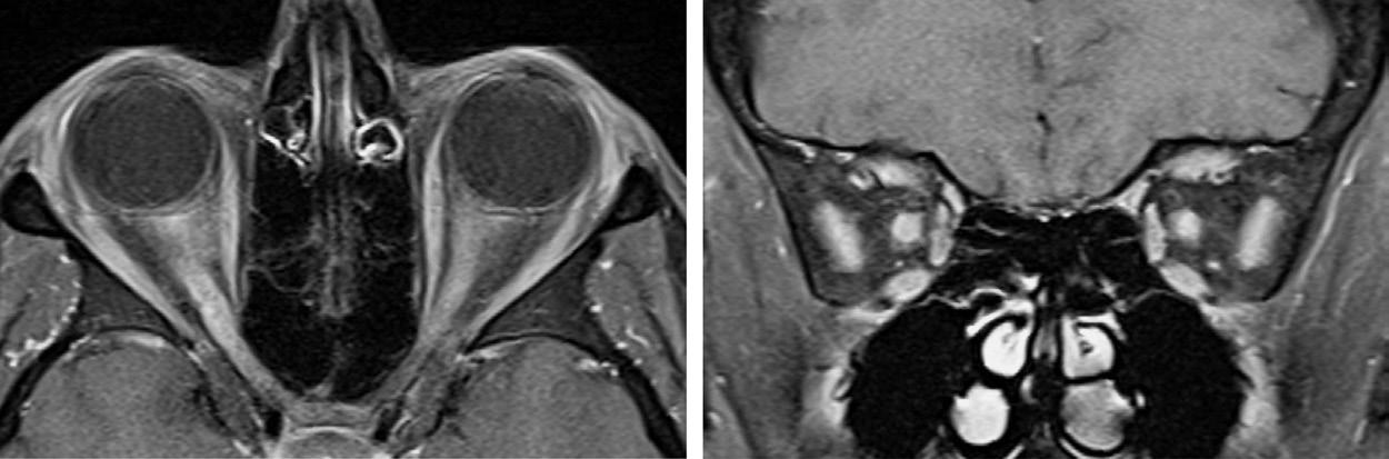 FIGU re 1.2. MRI of the orbits in a patient with bilateral optic neuritis in the setting of neuromyelitis optica, demonstrating longitudinally extensive bilateral optic nerve enhancement.