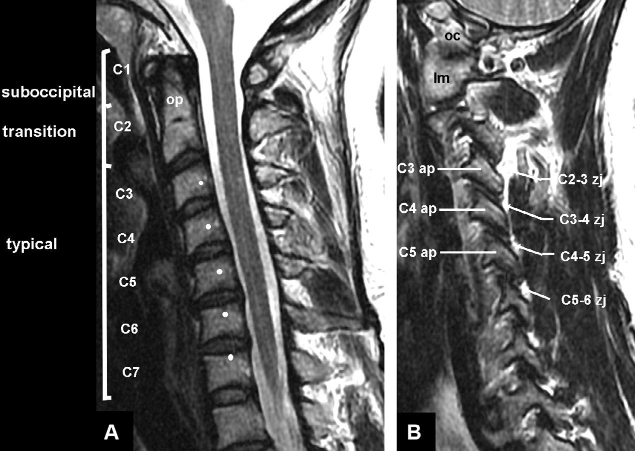 Fig.32.1. Sagittalmagneticresonanceimagesofthecervicalspine,showingitsstructureandzones.(A)Medianscan,showing thevertebralbodiesandinterverterbraldiscs.Thewhitedotsmarkthemeanlocationoftheaxesofrotationforflexion-extensionof thevertebraabove.Theodontoidprocess(op)projectsrostrallyfromthebodyofC2,toliebehindtheanteriorarchoftheatlas(C1). (B)Lateralscan,showingtheoccipitalcondyle(oc),thelateralmass(lm)oftheatlas(C1),thearticularpillars(ap),andthezygapophysialjoints(zj)thattheyform,atthesegmentslabeled.(CourtesyofDr.TimMaus,MayoClinic,Rochester,MN.)