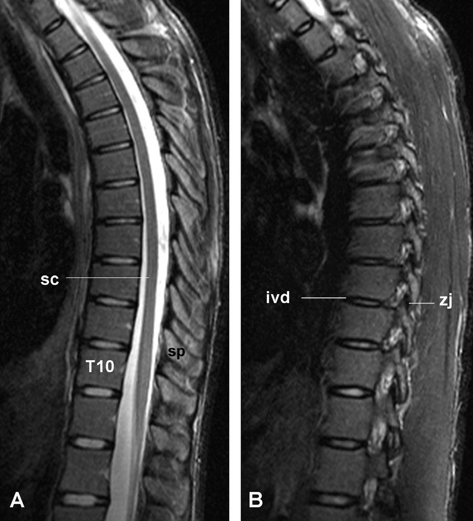 Fig.32.14. Sagittalmagneticresonanceimagesofthethoracic spine.(A)Mediansection,throughthevertebralbodies,spinal cord(sc),andspinousprocesses(sp)cord.(B)Paramediansectionthroughthezygapophysialjoints(zj).Intervertebraldiscs (ivd)areevidenceinbothsections.(CourtesyofDr.TimMaus, MayoClinic,RochesterMN.)