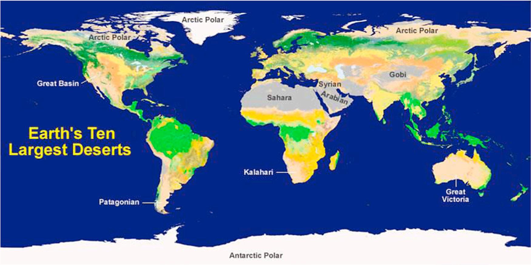 FIGURE 1.1 Map shows the generalized location of Earth’s ten largest deserts on the basis of surface area (http://geology.com/records/largest-desert.shtml).
