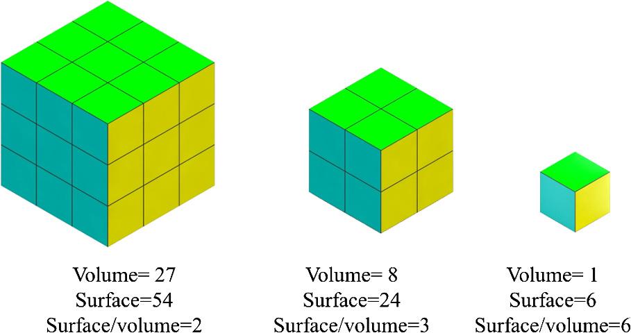 Figure1.12 Simpleillustrationofincreasingthesurfacetovolumeratiobyreducingthesize.