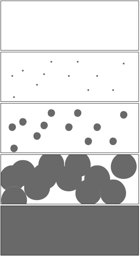 Fromtheconsiderationsabove,nucleationhasbeenidentifiedasthe preferredprocesstotransformtheoldphaseintothenewphase.However, nucleationisjustastart.Thenucleiareusuallyverysmall,andinmanycases alotofmonomersremainintheoldphase.Therefore,asignificantportionof thetransformationimpliesthegrowthofsupernuclei.Astheirsizeand numberincrease,theystarttocoalesce,untilallmonomersareconsumed. ThesedifferentstagesareschematicallydepictedinFigure2.2.Ourgoalin thefollowingsectionsistostudyeachoftheseprocessesaswellastheir interplay.