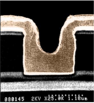 Figure1.5. Schematicrepresentationofthea)superconformal;b) subconformaldepositionregimes;c)earlyexampleofsuperconformal filladaptedfrom[AND98]