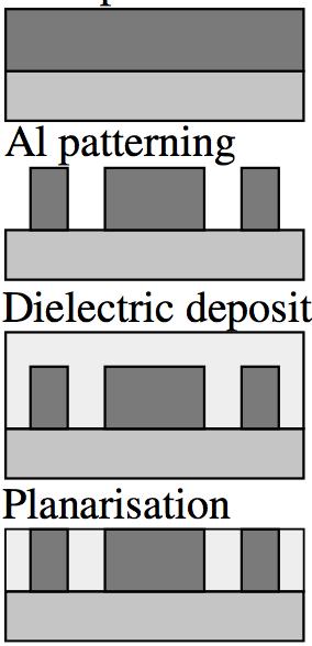 However,theintroductionofCuhasnotbeenstraightforward.Indeed,this metalwasnotcompatiblewiththeprocessflowusedtofabricateametallevel withAl.ThelatterisshowninFigure1.4(left).Inafirststep,Alisdeposited onthesubstrate(whichalreadyhasametallevelorcontactplugstothe transistorsifthisisthefirstmetallevel).Theconnectionstructures(linesor vias)arethenpatternedintothemetal.Inthisstep,theexcessmetalisetched toleaveonlythefinalstructures.Then,thedielectricmaterialisdeposited.A chemicalmechanicalpolishing(CMP)processisfinallyappliedtoremovethe excessinsulatingmaterialandtoplanarizethemetallevel.
