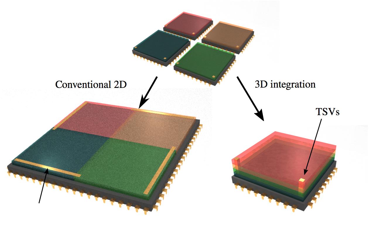 Figure1.7. Schematicrepresentationof3Dintegrationascomparedto theconventional2Dlayout.Thelonginterconnectlinesin2Dconventional assemblyarereplacedbyTSVsinthe3Dintegration.Foracolorversionof thisfigure,seewww.iste.co.uk/haumesser/metals.zip