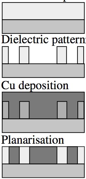 Itturnsoutthatthereisnoindustrialprocesscapableofproperlyetching Cu.Forthisreason,analternativeprocessflowwasdevised(Figure1.4 (right))[AND98].Inthissequence,alayerofdielectricmaterialisdeposited first,inwhichtheinterconnectstructuresareetched.Then,themetalfillsthe trenches(lines)orholes(vias)andtheexcessmetalisfinallypolishedaway. Thisarchitecturehasbeencalled damascene,afteranancienttechniqueused injewelleryinwhichgoldisinterlacedintoironorsteel[HES07].