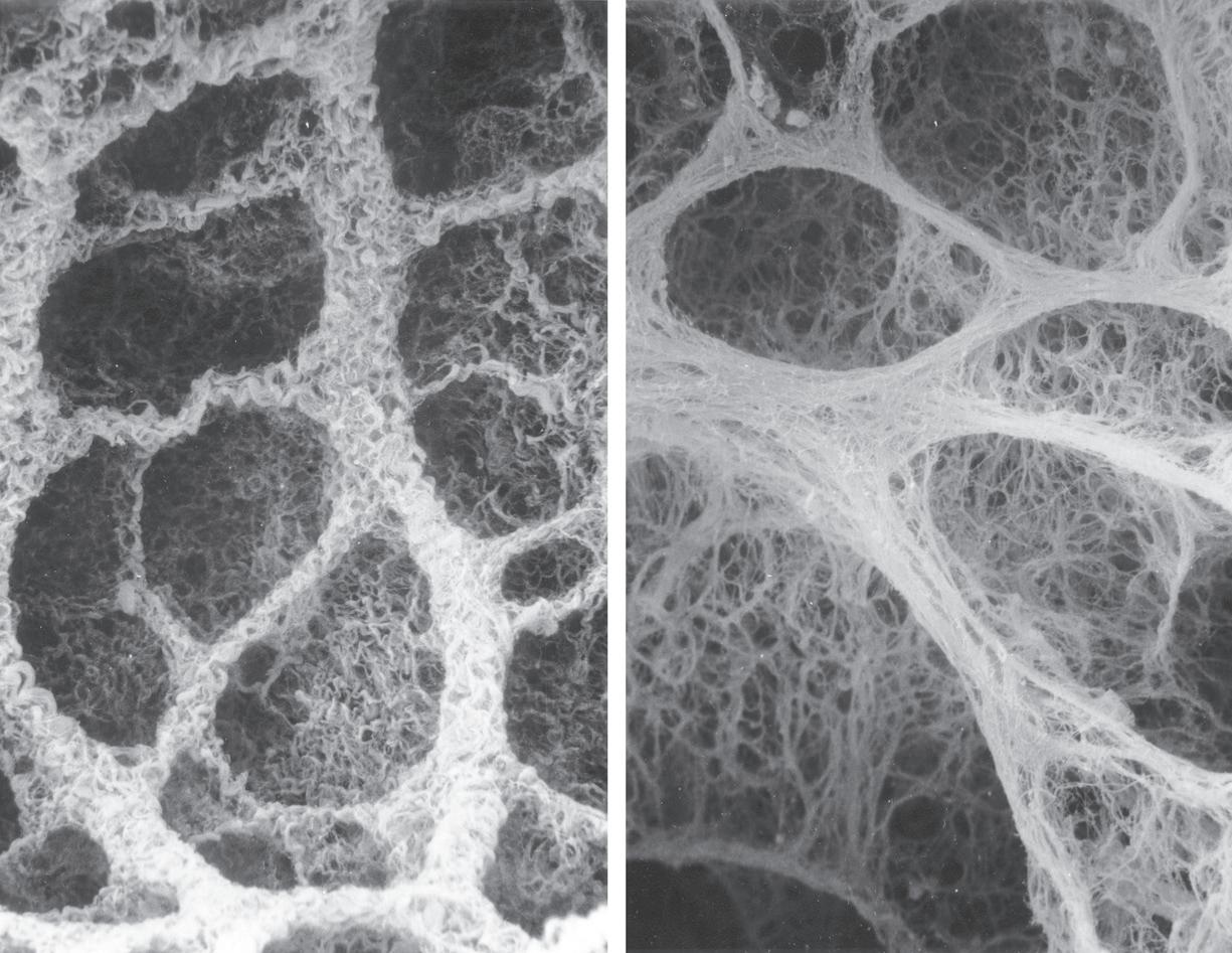• Fig. 1.10 Electron micrographs of the collagen fibre network of rat lung at low lung volume (A) and when fully inflated (B) 12 Note the folded, zigzag shape of the collagen at low lung volume in (A) (Photograph from Professor Ohtani. Reproduced by permission of Archives of Histology and Cytology.)