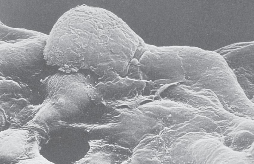• Fig. 1.12 Scanning electron micrograph of an alveolar macrophage advancing to the right over epithelial type I cells. Scale bar 5 3 mm. (From Weibel ER. The Pathway for Oxygen Cambridge, Mass.: Harvard University Press; 1984. With permission. © Harvard University Press.)