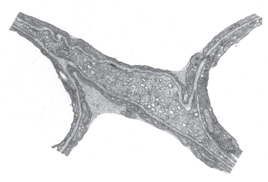 As a result, capillaries pass repeatedly from one side of the fibre scaffold to the other (Fig. 1.7), the fibre always residing on the thick (or service) side of the capillary, allowing the other side to bulge into the lumen of the alveolus. The left side of the capillary in Figure 1.8 is the side with the fibres. Structural integrity of the whole fibre scaffold is believed to be maintained by the individual fibres being under tension, referred to as a tensegrity structure, 11 such that when any fibres are damaged, the alveolar septum disintegrates and adjacent alveoli change shape, ultimately leading to emphysema.