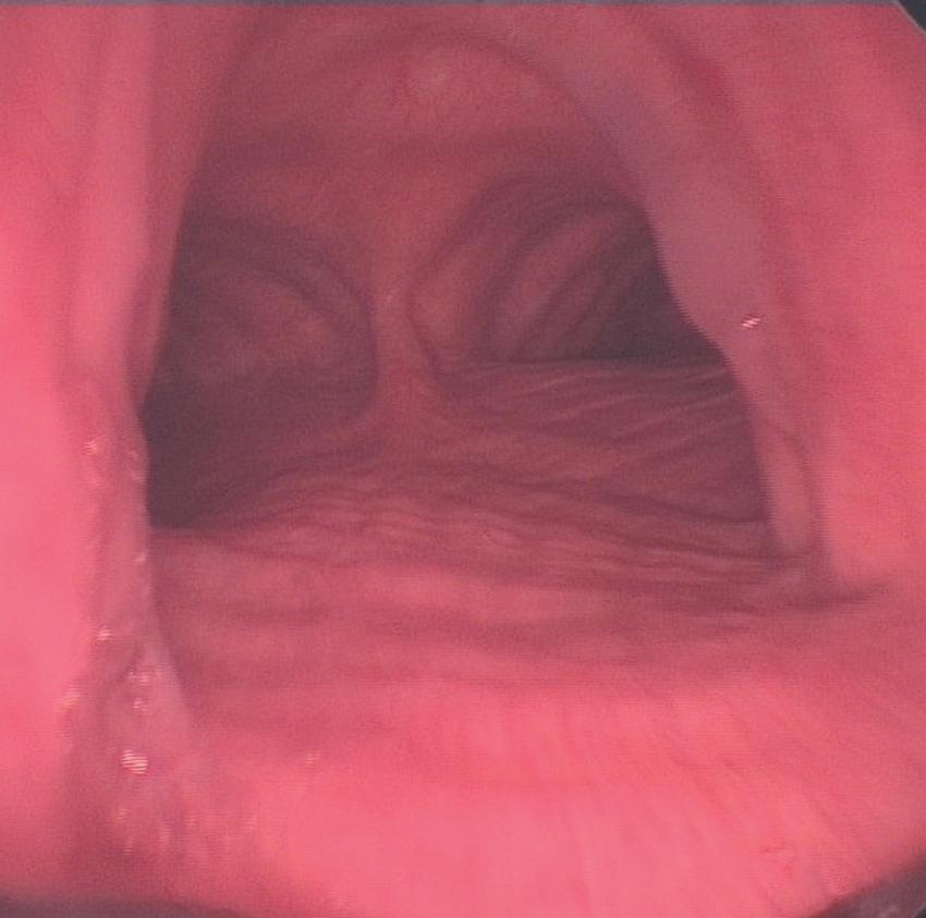 • Fig. 1.3 The normal trachea as viewed during a rigid bronchoscopy (page 399). The ridges of the cartilage rings are seen anteriorly, and the longitudinal fibres of the trachealis muscle are seen posteriorly, dividing at the carina and continuing down both right and left main bronchi. The less acute angle of the right main bronchus from the trachea can be seen, with its lumen clearly visible, illustrating why inhaled objects preferentially enter the right lung.