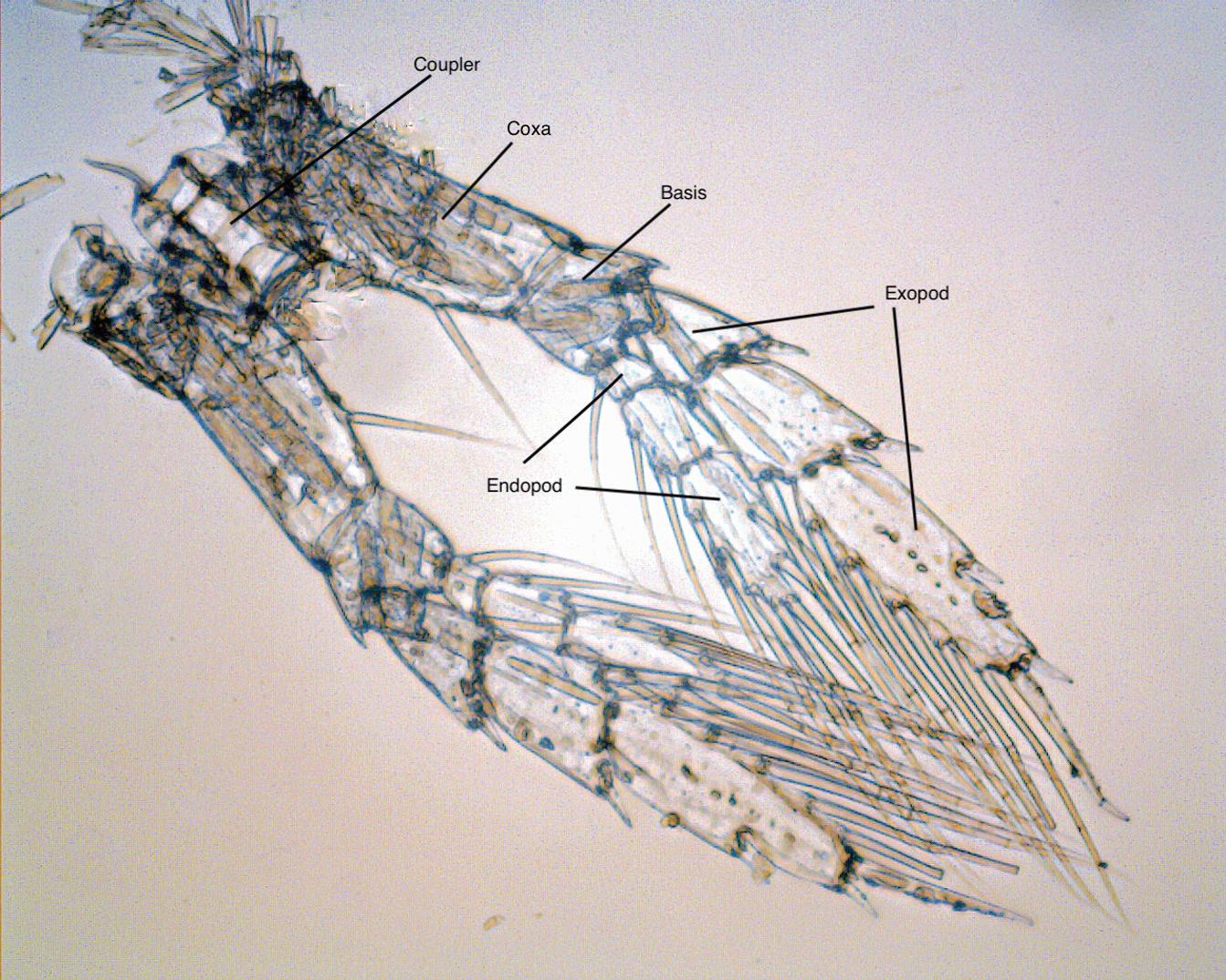 Figure 1.5 Neocalanus plumchrus, fifth copepodite: fourth thoracic leg (P4) from a preserved specimen. Segment names are given. Dissection and micrograph graciously provided by Atsushi Yamaguchi (University of Hokkaido). Some setae are broken, which is common for net-caught copepods.