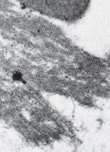 Fig. 1.8 A, Cobweb appearances of fibrinous exudate, stained with periodic acid–Schiff. Cells use fibrin as scaffold to move and to lay down reparative materials. B, Electron micrograph shows periodicity of fibrin cut in longitudinal section. C, Fibrin cut in cross-section.