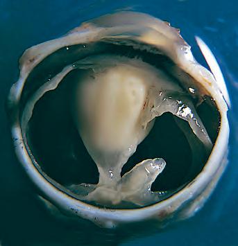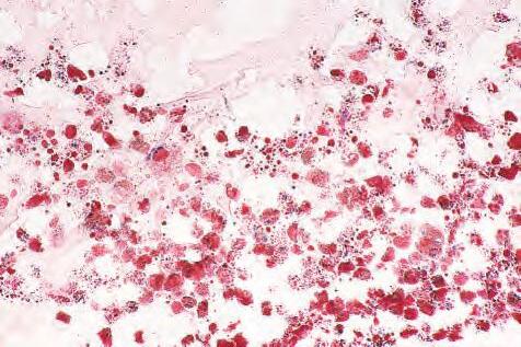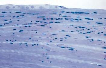2. Fibrinous exudate (Fig. 1.8) has high fibrin content (e.g., as seen clinically in a “plastic” aqueous).