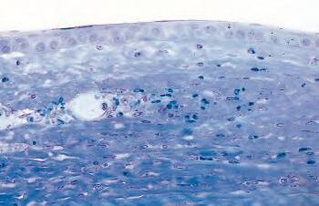Fig. 1.7 A, Mast cell seen in center as round cell that contains slightly basophilic cytoplasm and round to oval nucleus. B, Mast cells show metachromasia (purple) with toluidine blue (upper right and left and lower right) and C, positive (blue) staining for acid mucopolysaccharides with Alcian blue. D, Electron microscopy of granules in cytoplasm of mast cell often shows typical scroll appearance.