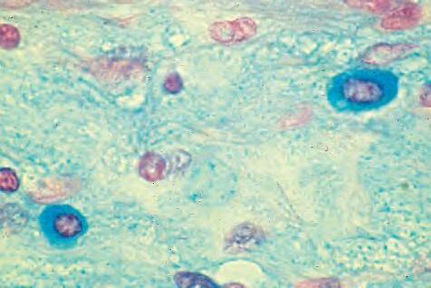 b. Russell body (Fig. 1.16C and D): This is an inclusion in a plasma cell whose cytoplasm is filled and enlarged with eosinophilic grapelike clusters (morular form), with single eosinophilic globular structures, or with eosinophilic crystalline structures; usually the nucleus appears as an eccentric rim or has disappeared.