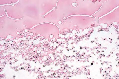 a. Langhans’ giant cell (Fig. 1.19; see Fig. 1.17): This is typically found in tuberculosis, but it is also seen in many other granulomatous processes. When sectioned through its center, it shows a perfectly homogeneous, eosinophilic, central cytoplasm with a peripheral rim of nuclei.