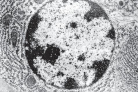 Fig. 1.15 Plasma cell. A, Plasma cells are identified by eccentrically located nucleus containing clumped chromatin and perinuclear halo in basophilic cytoplasm that attenuates opposite to nucleus. Plasma cells are larger than small lymphocytes, which contain deep blue nuclei and scant cytoplasm. B, Electron microscopy shows exceedingly prominent granular endoplasmic reticulum that accounts for cytoplasmic basophilia and surrounds nucleus. Mitochondria are also present in cytoplasm.