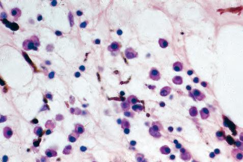 c. Touton giant cell (Fig. 1.21), frequently associated with lipid disorders such as juvenile xanthogranuloma, appears much like a Langhans’ giant cell with the addition of a rim of foamy (fat-positive) cytoplasm peripheral to the rim of nuclei.