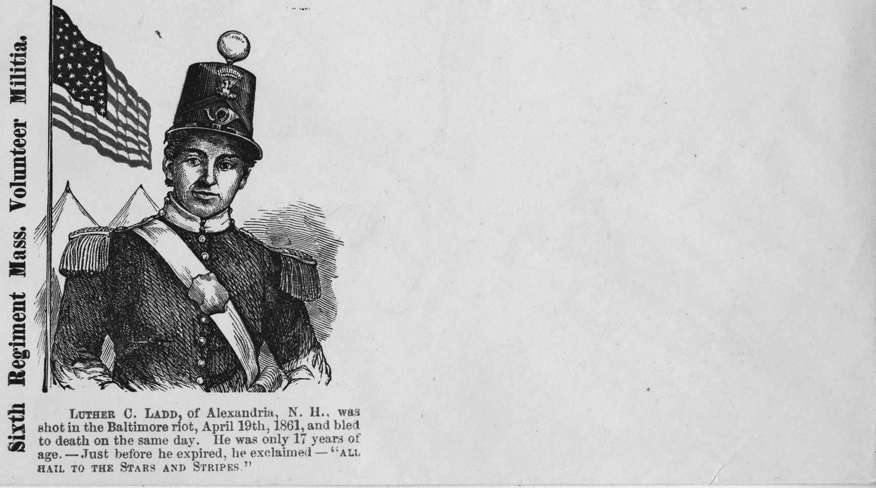 Figure I.2 Luther C. Ladd was among the first soldiers killed in the war. When his body and that of his comrade and fellow mill worker, twenty-one-year-old Addison Whitney, were returned Lowell, Massachusetts, the town shut down the mills and staged a massive joint funeral. In 1865 the community erected a monument in honor of the two youths, but national attention singled out only Ladd, suggesting the appeal and propaganda value of boy soldiers. “Luther C. Ladd” (1861). Lincoln Envelopes. Brown Digital Repository. Brown University Library. https://repository.library.brown.edu/studio/item/bdr:575834/