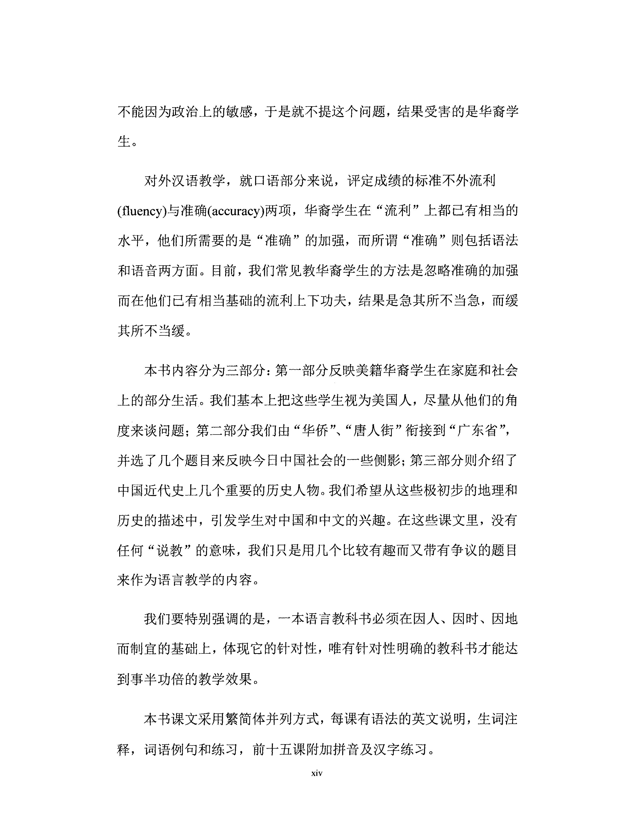 The contents of the lessons in this book comprise three parts. The first part looks at home life and social life in America of Chinese-American young people; the second part links the ideas of "overseas Chinese" and "Chinatown" to life in "Guangdong province," and includes vignettes of daily life in China; the third part introduces some major figures in modem Chinese history. We feel that these themes will suit your practical needs in using Chinese and will provide a bridge to using Chinese for advanced study of China.