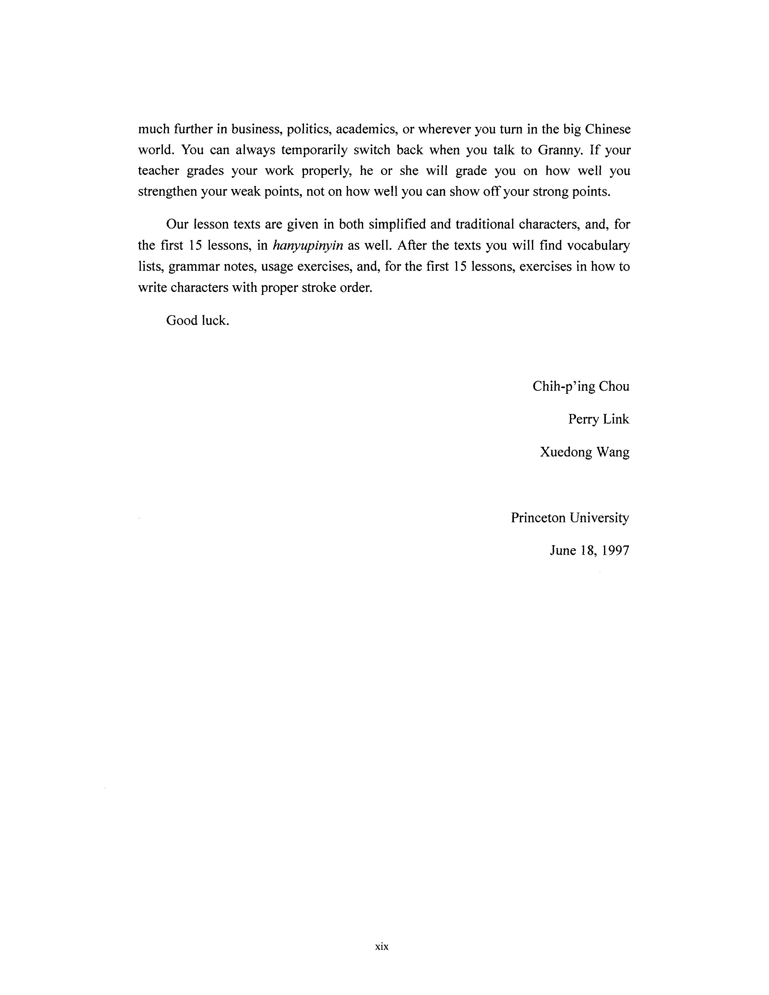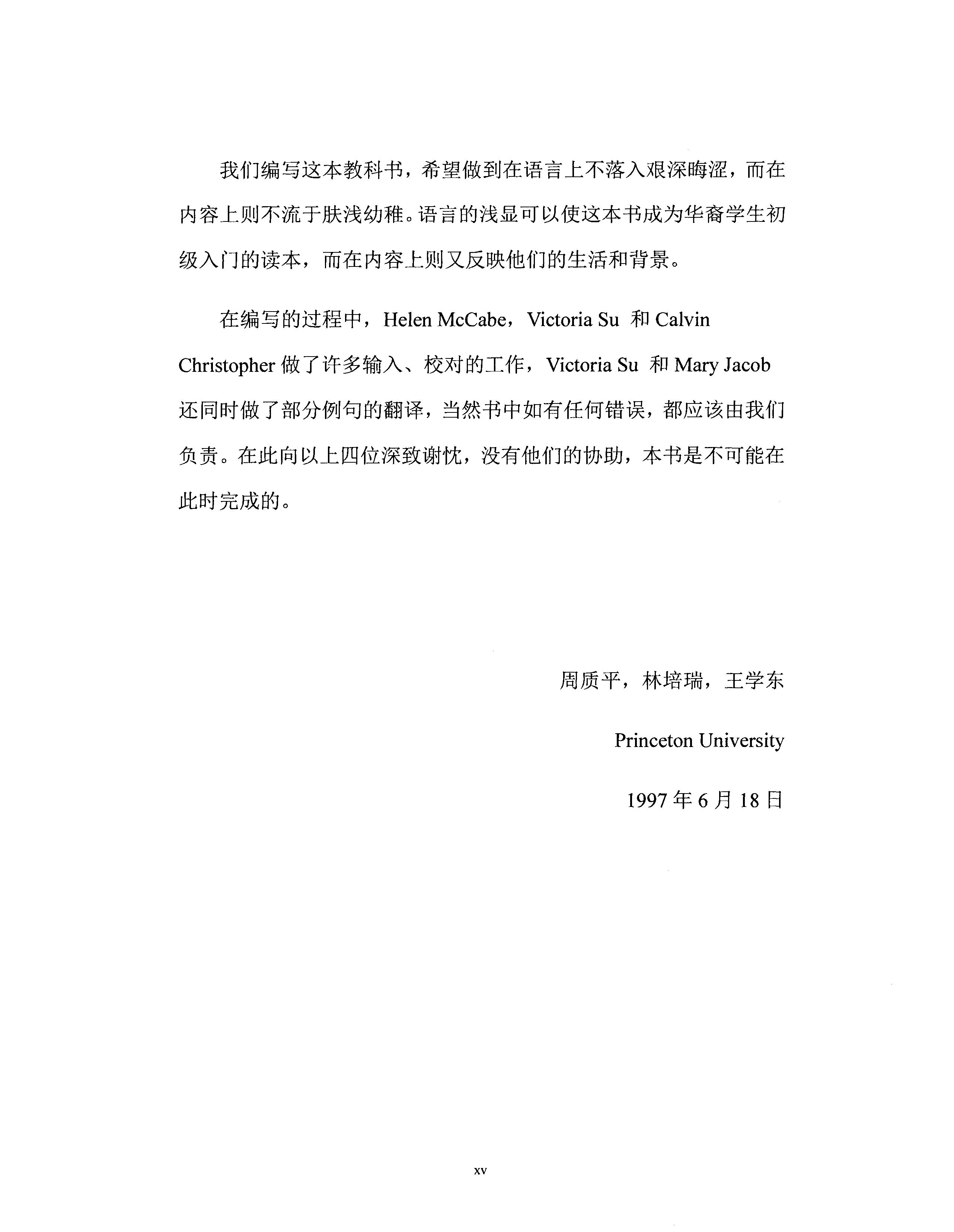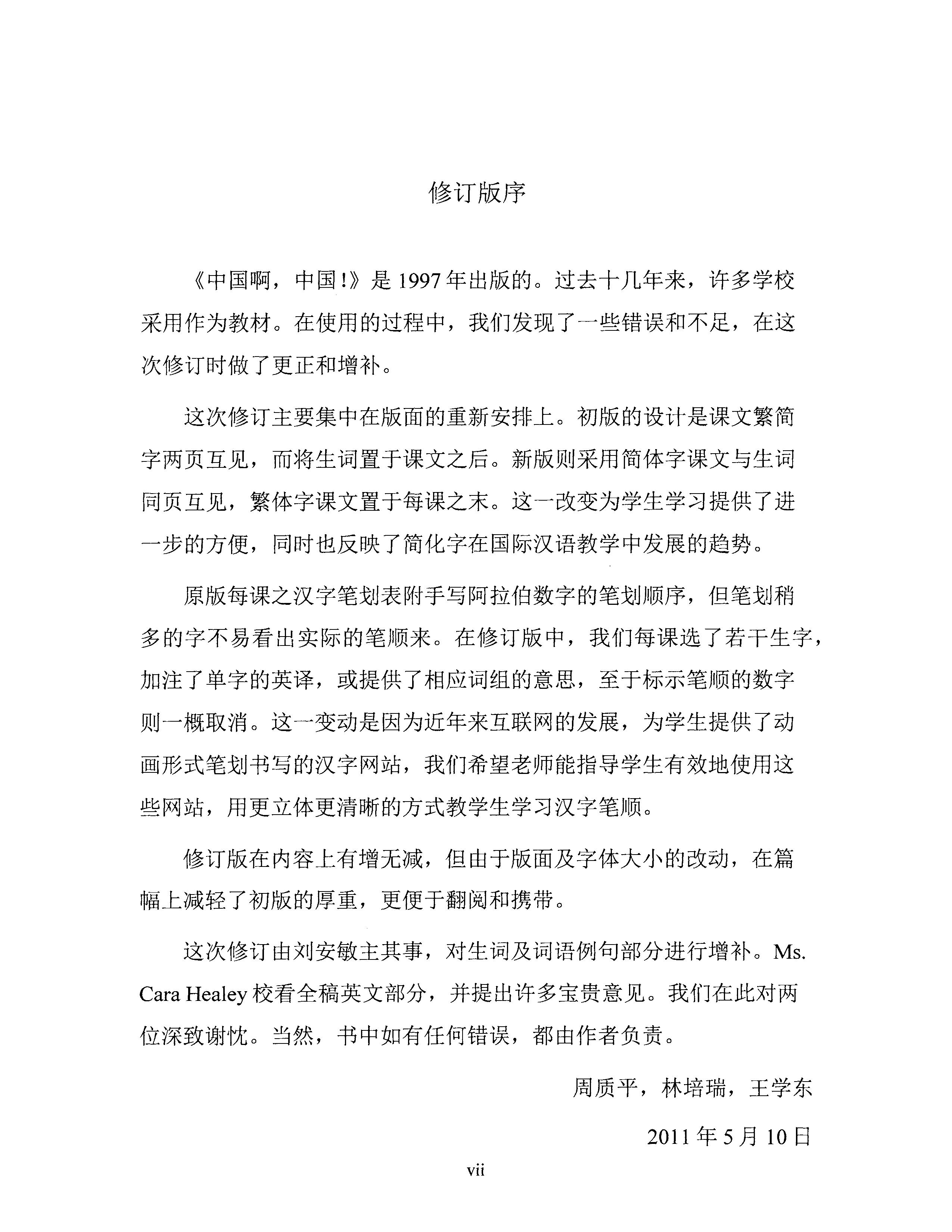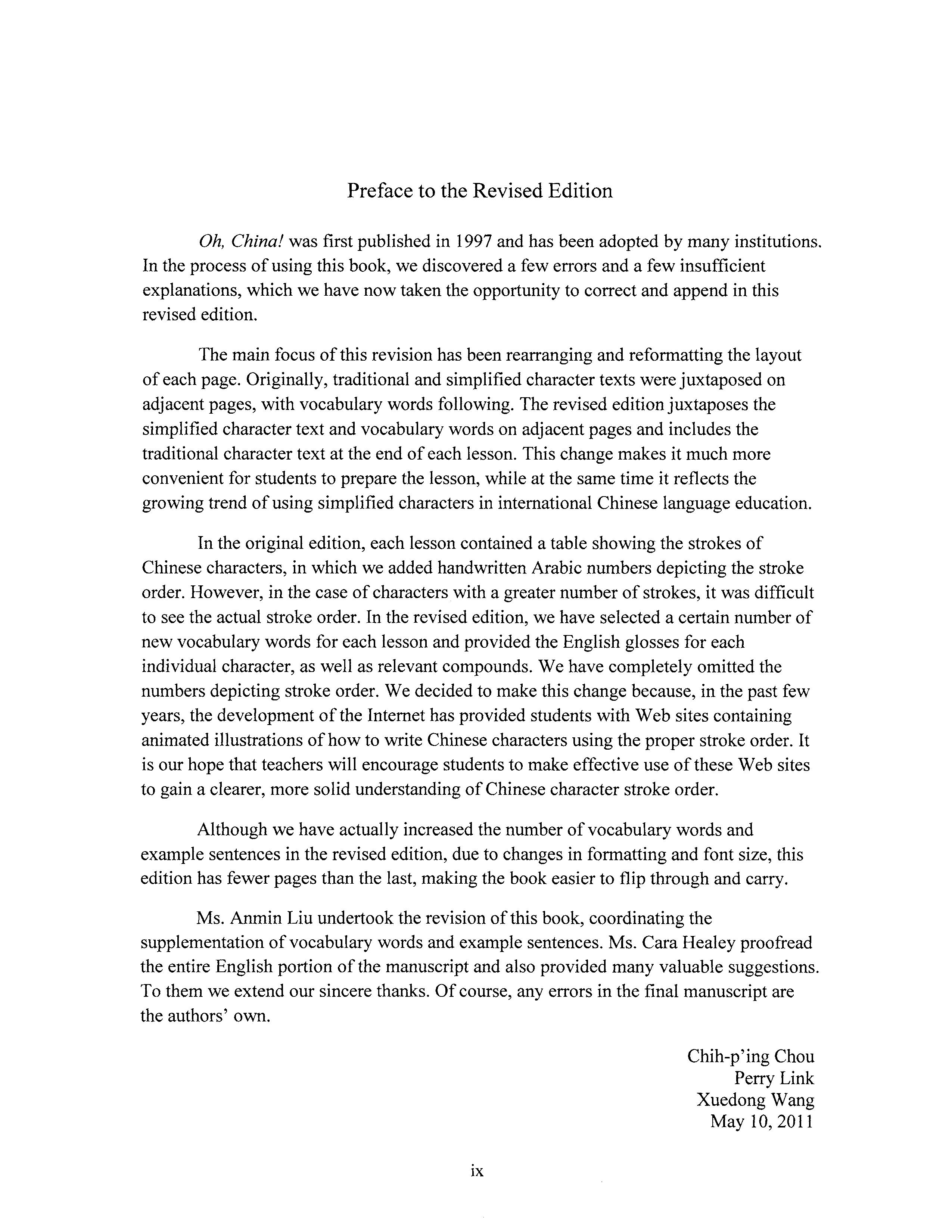 Ms. Anmin Liu undertook the revision of this book, coordinating the supplementation of vocabulary words and example sentences. Ms. Cara Healey proofread the entire English portion of the manuscript and also provided many valuable suggestions. To them we extend our sincere thanks. Of course, any errors in the final manuscript are the authors' own.