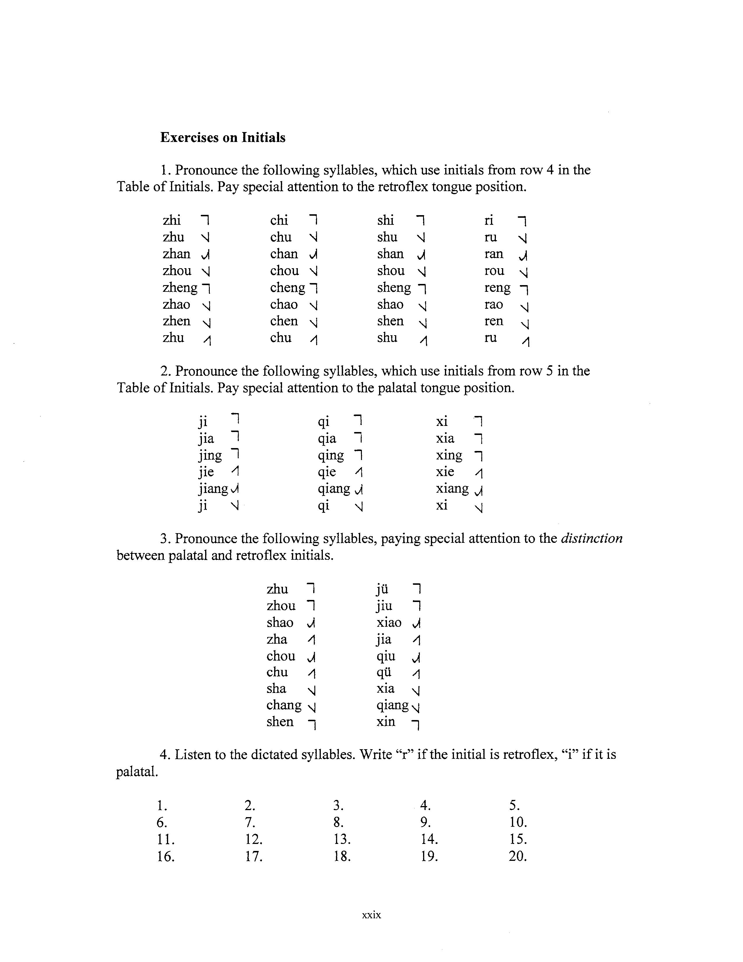 1. Pronounce the following syllables, which use initials from row 4 in the Table of Initials. Pay special attention to the retroflex tongue position.