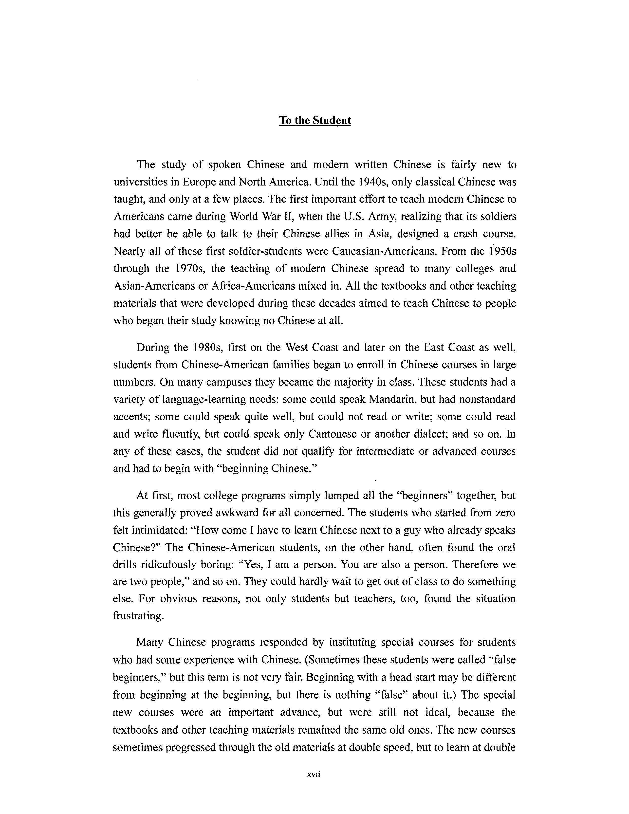 Many Chinese programs responded by instituting special courses for students who had some experience with Chinese. (Sometimes these students were called "false beginners," but this term is not very fair. Beginning with a head start may be different from beginning at the beginning, but there is nothing "false" about it.) The special new courses were an important advance, but were still not ideal, because the textbooks and other teaching materials remained the same old ones. The new courses sometimes progressed through the old materials at double speed, but to learn at double