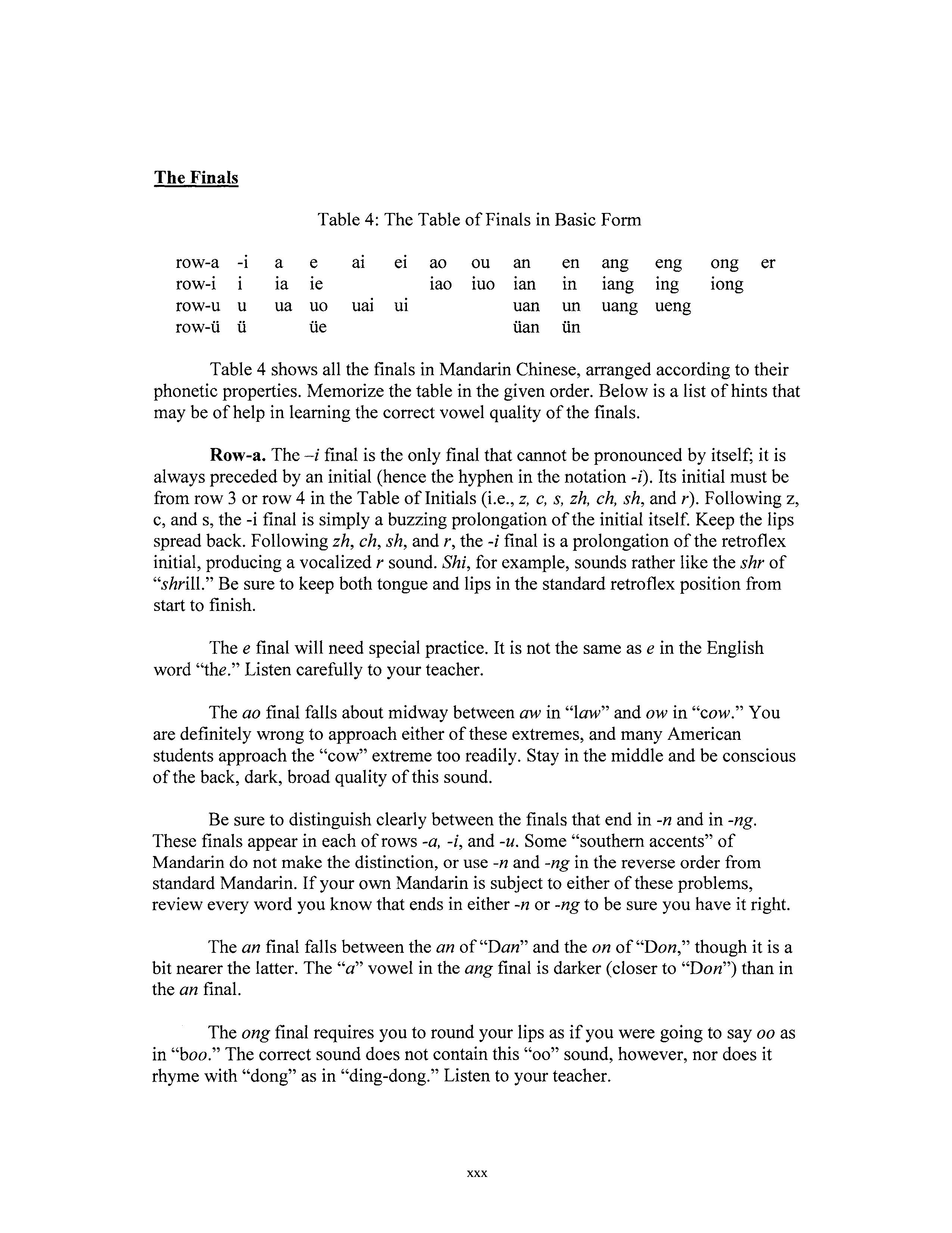 Table 4 shows all the finals in Mandarin Chinese, arranged according to their phonetic properties. Memorize the table in the given order. Below is a list of hints that may be of help in learning the correct vowel quality of the finals.